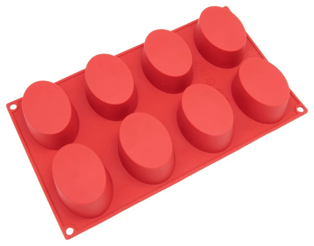 Create your own special desserts or homemade soaps with the Freshware SL-118RD 8-Cavity Oval Silicone Mold for Soap, Cake, Bread, Cupcake, Cheesecake, Cornbread, Muffin, Brownie, and More. This mold is constructed with 100% pure, premium quality food-grade silicone, which meets US FDA and European LFGB safety standards (BPA, PVC and Phthalate FREE). Simply pour your favorite recipe in the mold, prepare, and cool completely. Then turn it upside down, this flexible silicone mold offers a non-stick surface that allows the baked goods to pop right out with a little push from the bottom. Remember to place the silicone mold on a baking sheet for easier positioning and removal.