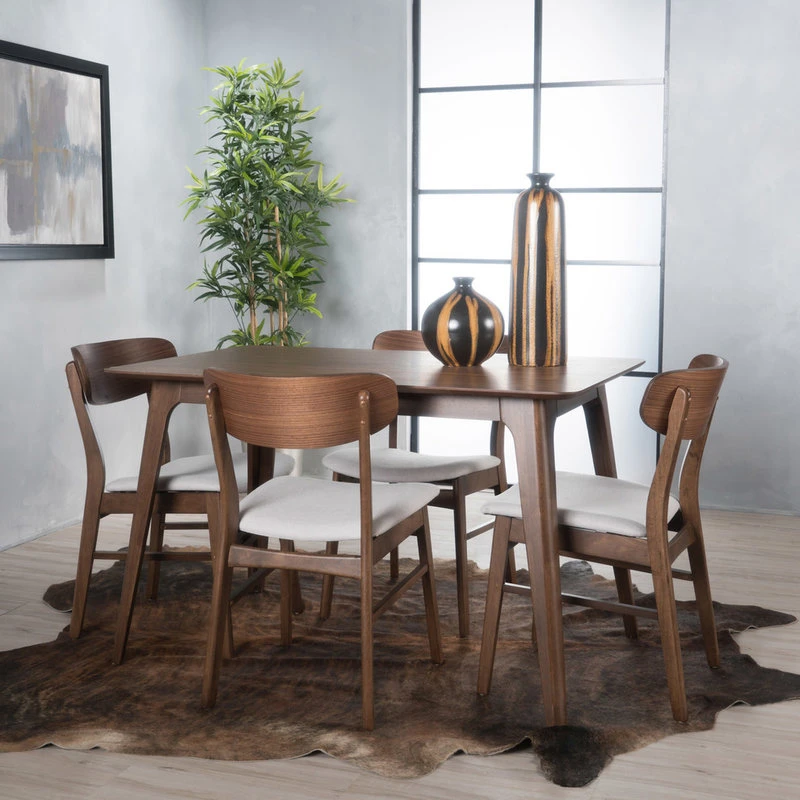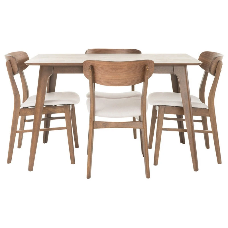 With matching wood finishes, you can’t go wrong with this dining set. Including one table and four chairs, this set is ideal for any home. The mid-century style and smooth wood finishes of this set will compliment any d̩cor, so you don’t have to worry about clashing color pallets in your home. The dining chairs feature a sturdy design with soft fabric cushioned seats, providing both comfort and style for your dining pleasure.