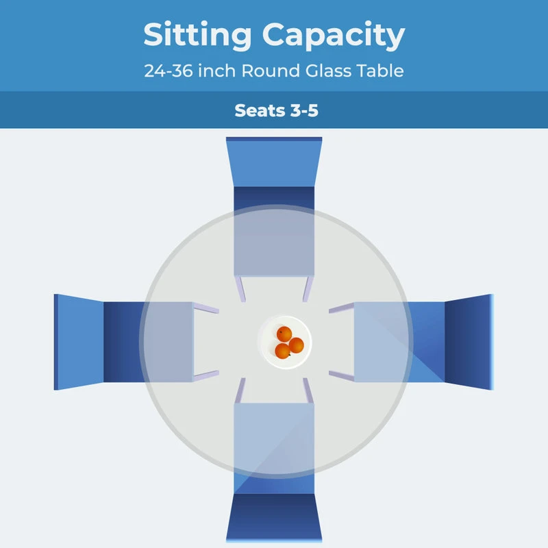 Clear glass: 30 Flat Polished Edge, Tempered, 1/2 thick round clear glass tabletop is processed to be as close to perfect as possible through a curing process yields no air bubbles.