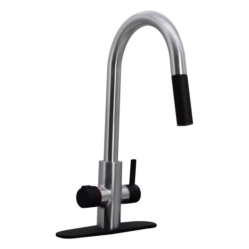 The kitchen is the center of the home. It is more than a space to cook and clean, it reflects the culture and taste of the homemaker, and the art and skill for meal preparation. Westbrass offers for you this 4 in 1 faucet, blending function and style with ease of use in a single neat, clean package. First note its classic, sleek style. The rotary mixer valve is simple to use and easy to understand. This valve will not be hampered by the closeness of the backsplash. It closes when vertical! Combining with a pull-out spray head with dual spray control, the 4 in 1 makes cleaning, rinsing and prepping easy, leveraging the most out of your kitchen faucet. The right side of the faucet allows the user to dispense purified water or instant hot water. Rotate backwards for pure water. Activate knob and turn towards you to activate the instant hot water appliance.
