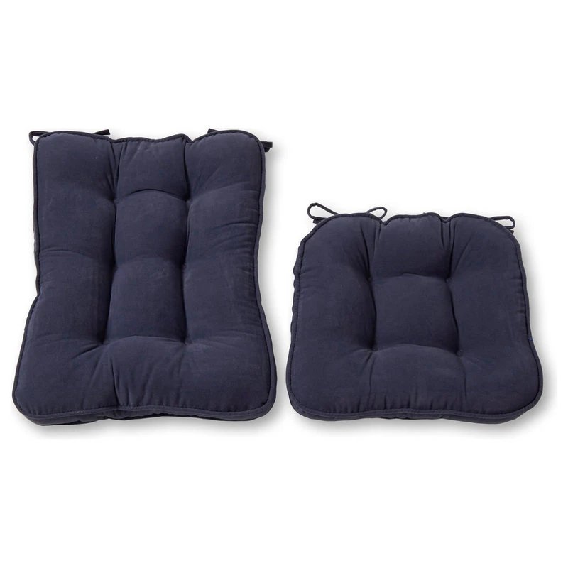 Add soft, plush comfort to your rocker with this Greendale Standard Rocking Chair cushion set. Made from 100% nylon microfiber fabric in assorted solid colors. This rocker cushion set is fully reversible. Set consists of two cushions: 1 seat cushion (17 in W X 15 in D) and 1 back cushion (17 in W X 22 in H). Cushion sets are 3″ thick. Cushions have a boxed, corded edge trim and 4 circle tacks. String ties are attached to the backs of both cushions. The rocker cushions are fully tufted and filled with 100% polyester fiberfill. Home furnishings for indoor use. Spot clean only. Filled and finished in the USA. (Cushions are + or – 1.5)