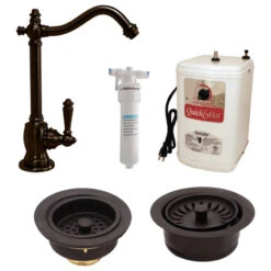 Solid brass faucet with Tank (QHT-1) includes carbon block filter, (F400) mounting bracket and Two Pack D214 Basket and D2089SEV Disposer, Large Post nut style kitchen sink basket and strainer