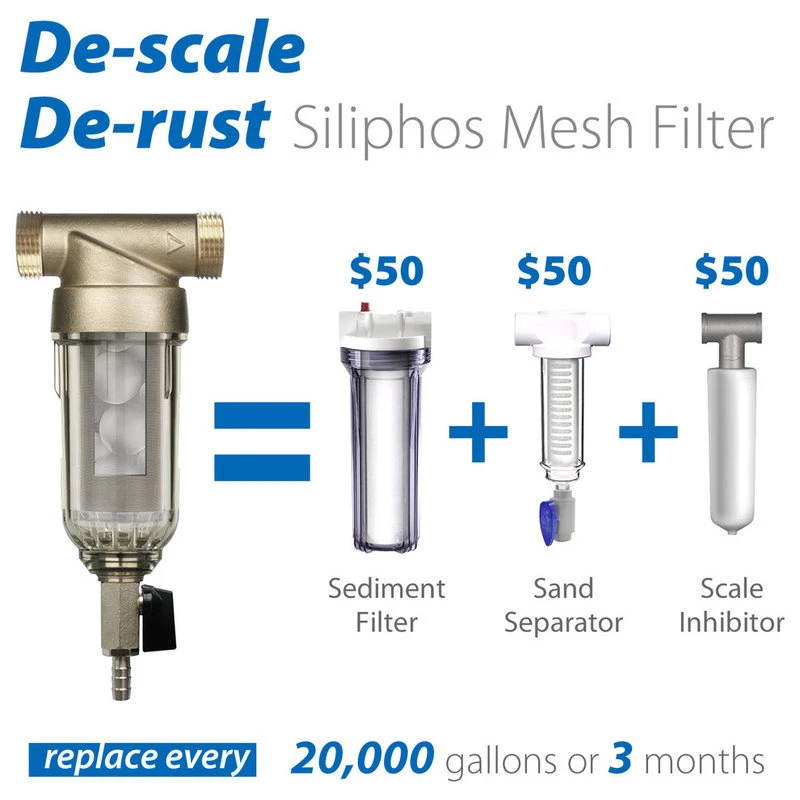 - Includes Siliphos to help prevent scale and stop corrosion, greatly extending the life of your plumbing fixtures. It is recommended that the filter to be replaced every 3-6 months to prevent scale from building up.