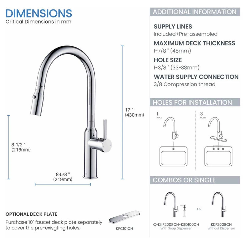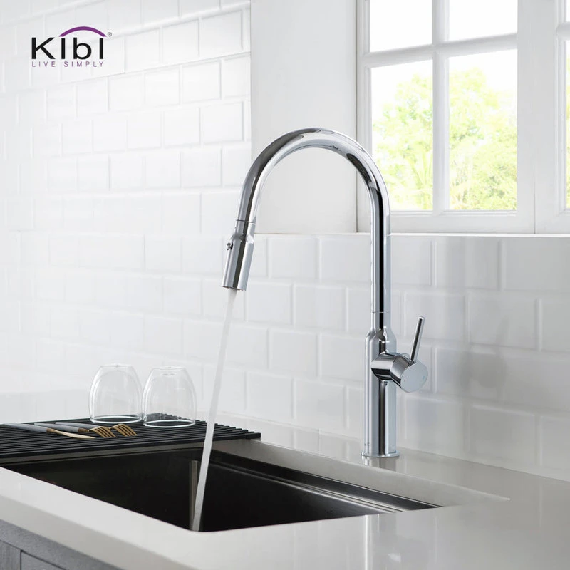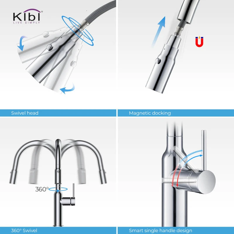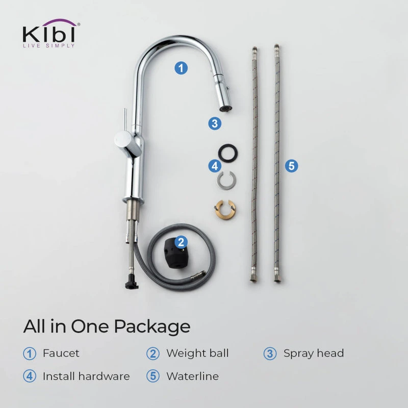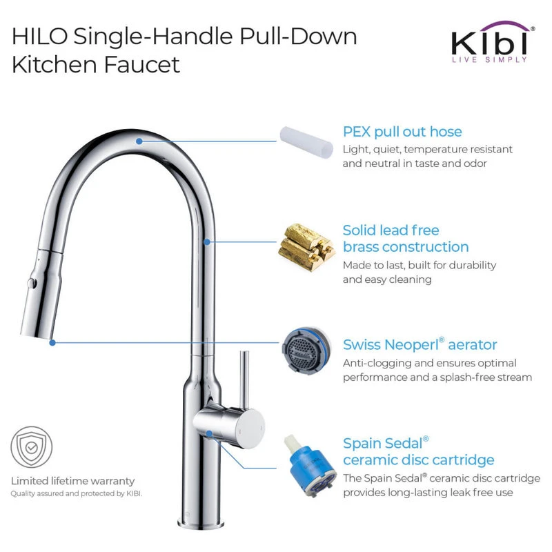 “The KIBI Hilo Single-Handle Pull-Down Sprayer Kitchen Faucet is a sleek design sure to inspire. This faucet features a unique look and easy functionality. The 2 function sprayer allows for full spray and aerated spray, perfect for everyday cleaning. The Swiss Neoperl aerator provides excellent water pressure and the Spain Citec ceramic disc valve ensure drip-free performance. Easy to install, this faucet will meet all your faucet needs and last up to lifetime long uses.