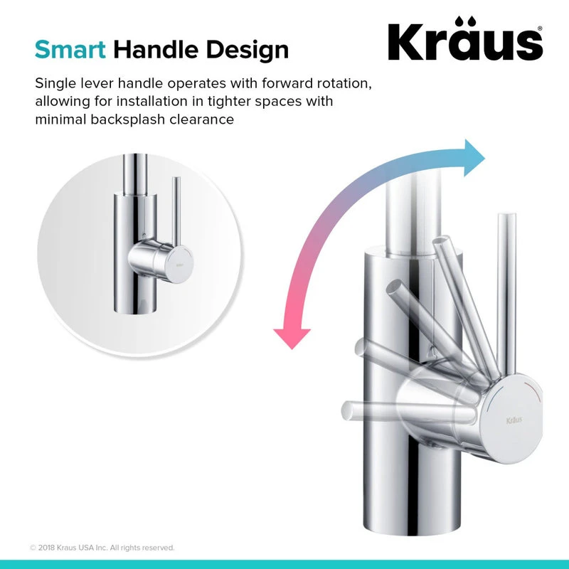 Kraus KPF-2620 Features: Fully covered under Kraus’ limited lifetime warranty Long-Lasting Performance: Heavy-duty all-metal construction All-Brite™ spot-free finish provides resistance to water spots, fingerprints and fading (Spot Free Stainless Steel only) High-quality, corrosion and rust resistant finish – finish covered under lifetime warranty Reach™ Pull-Down Technology: Easy-retract flexible hose with ability to flex, pivot, and reach all around the sink GlideAssure Technology: Sprayer hose effortlessly glides in and out of faucet High-arch gooseneck spout further allows for unobstructed sink access Dual-function pull-down spray head Two Settings: spray and stream Easy-Clean Spray Nozzles allow you to wipe away any mineral buildup Spout swivels 360 degrees to allow for unobstructed sink access Easy DIY quick dock top mount installation All-Brite™ spot-free finish provides resistance to water spots, fingerprints and fading Product Technologies / Benefits: QuickDock™ Technology: QuickDock™ Technology is an innovative feature that makes the installation of faucet’s easier than ever before. QuickDock™ allows you to install the faucet from above the counter, eliminating the need to secure it underneath the sink. With faucet installation only having 4 simple steps, Kraus’ QuickDock™ Technology has simplified and improved the installation experience for all professional and Do-It-Yourself customers alike. All-Brite: Finishes with All-Brite resist spots and fingerprints requiring less cleaning and helping to allow the faucet shine longer without the need for cleaning after each use Kraus KPF-2620 Specifications: Overall Height: 15-3/4″ (measured from counter top to highest part of faucet) Spout Height: 8-1/4″ (measured from counter top to spout outlet) Spout Reach: 8-3/4″ (measured from center of faucet base to center of outlet) Flow Rate: 1.75 GPM (gallons per minute) Maximum Deck Thickness: 1″ to 1-1/2″ (cannot mount to thicker decks without extension kit) Faucet Holes: 1 (number of holes required for faucet installation) Alternate Models: KPF-1630 KPF-1622 KPF-2720