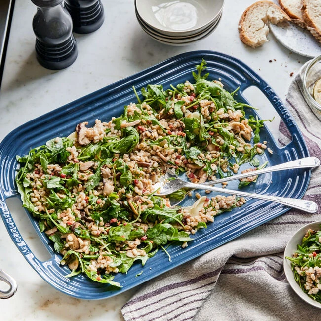 The stoneware Serving Platter features ridged edges that slope upward to contain food, while two wide handles are cut into each end to ensure a steady grip when carrying heavier foods like roasts or poultry from oven to table. Crafted from premium stoneware in our irresistible colors, the serving platters are part of our tableware collection and finished with a vibrant glaze which is easy to clean, dishwasher-safe, and resistant to chips, scratches and stains. Designed to stay beautiful with daily use, Le Creuset’s tableware brings elegant style to every table and occasion.