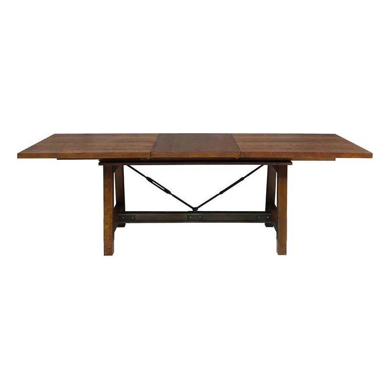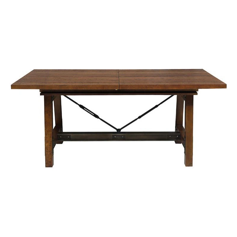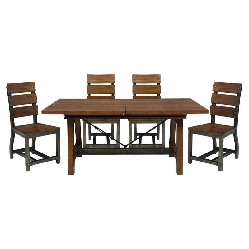 Heavily influenced by industrial design, the Holverson Collection will lend a unique look to your personal space. Gunmetal finished wood framing provides sturdy structure and profile to each piece in this collection. Faux rivets provide additional detail to the metal bracketing that is prominently on display. A rustic brown milk crate finish is utilized to highlight the acacia veneer. Rectangular dining height table allows for perfect placement within your casual dining space. Side chair for both table heights present the opportunity to customize seating to fit your lifestyle.