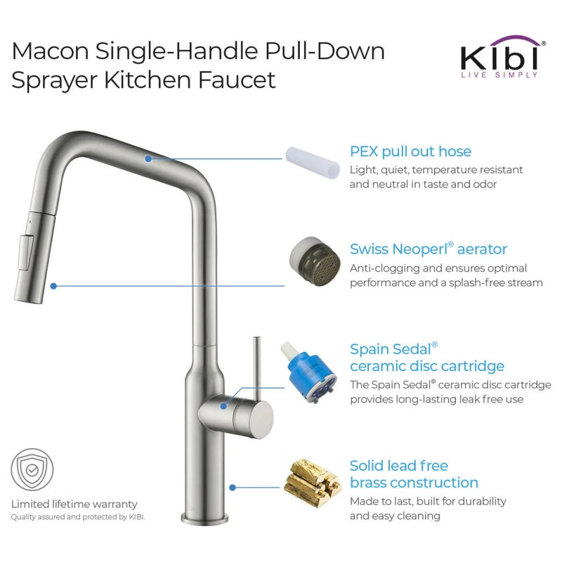 “This Macon Single-Handle Pull-Down Sprayer Kitchen Faucet with Magnetic docking. The pull-down spray wand comes free with a gentle tug and gives you total flexibility. The hose extends and retracts without friction points, fed by gravity. As you raise the wand to dock it, the magnet embedded in the spout pulls the wand precisely into place. So, unlike other pull-downs that tend to droop over time, Magnetic keeps your pull-down faucet looking picture-perfect. The well-considered