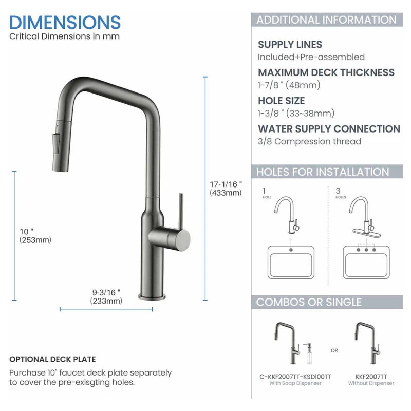 - Dimensions: faucet height: 17 inch, spout height: 9-9/16 inch, spout reach 8-7/8 inch.