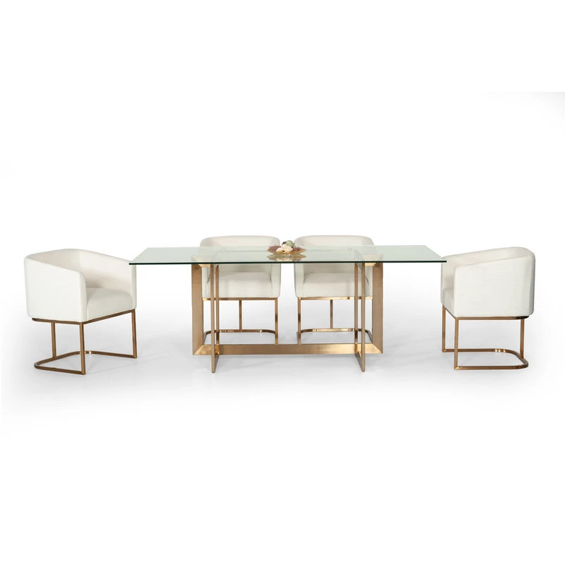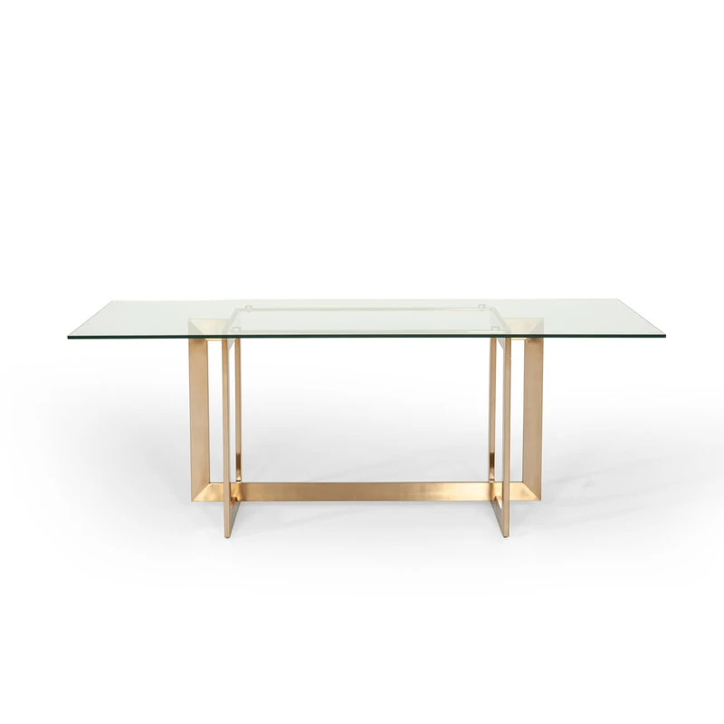 The Modrest Keaton Modern Glass & Brass Dining Table is a picture of charm and gracefulness featuring a rectangular 12mm clear tempered glass top that rests on a sturdy brushed stainless steel frame with lustrous brass finishing. It has a dimension of W79″ x D39″ x H30″ and seats 6 persons comfortably. The Chrysler Buffet included in the picture is available separately.