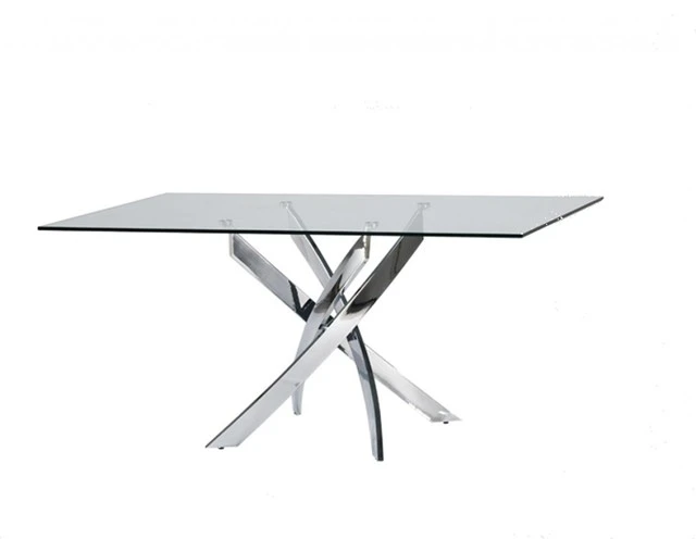 Rectangular clear tempered glass is held up by entwining chrome legs to create a poised composition. Table comfortably fits six people. Also available as a round table.