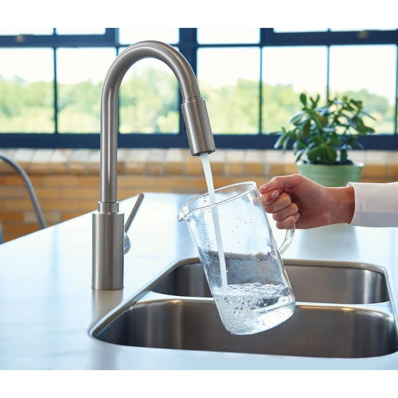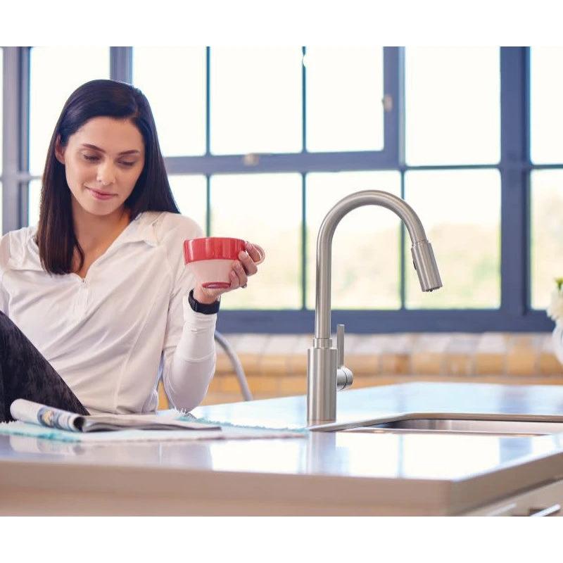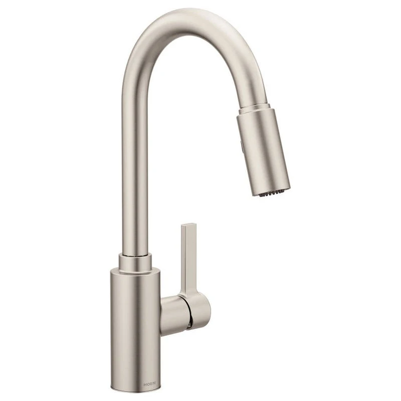 Moen 7882 Features: Covered under Moen’s limited lifetime warranty Metal faucet body 2-Function pull-down spray head High-arch gooseneck spout Spout swivels 360 degrees Single metal lever handle Cover plate (escutcheon) for sinks with 3-holes (8″ centers) included ADA compliant California low flow compliant – 1.5 gallons-per-minute flow rate at 60psi Installation hardware included Moen 7882 Technologies: Reflex™ pulldown – offers smoother operation, easy movement, and secure docking PowerClean™ Spray Technology – provides 50% more spray power Duralock™ – quick connection snaps for simplified installation Moen 7882 Specifications: Height: 16″ (counter top to highest point of faucet) Spout Height: 9-3/8″ (counter top to faucet outlet) Spout Reach: 7-11/16″ (center of faucet base to center of faucet outlet) Flow Rate: 1.5 gallons-per-minute Single Hole Faucet Escutcheon Width: 10-3/8″