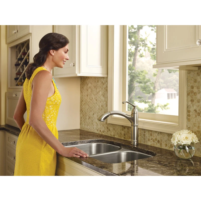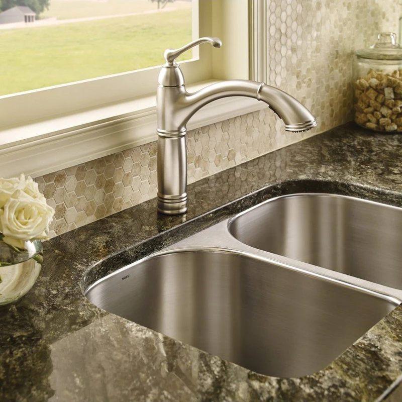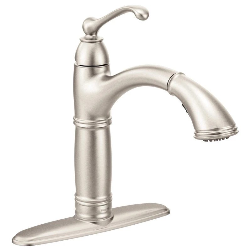 Brantford kitchen and bar/prep faucets make a traditionally styled space feel truly finished. The spout enhances the curvature of the faucet body and handle for a beautiful, polished look. The pulldown spray wand offers Moens exclusive Power Boost technology for improved functionality at your fingertips.