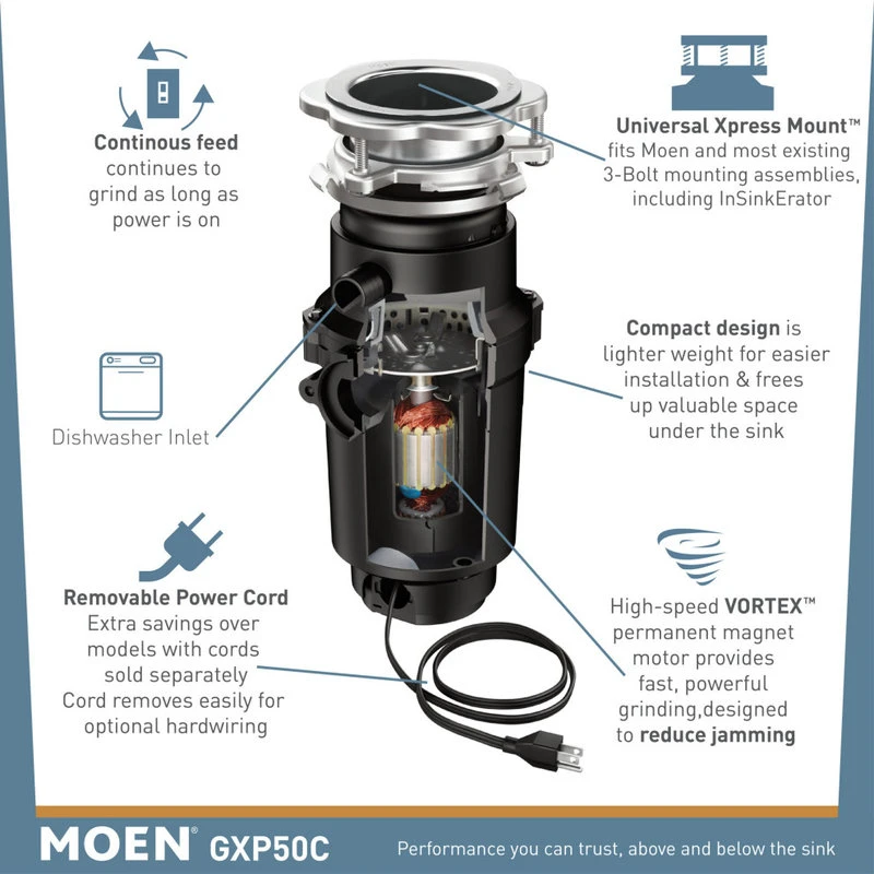 - Includes power cord, splash guard, flange and drain stopper, drain elbow, and mounting assembly.