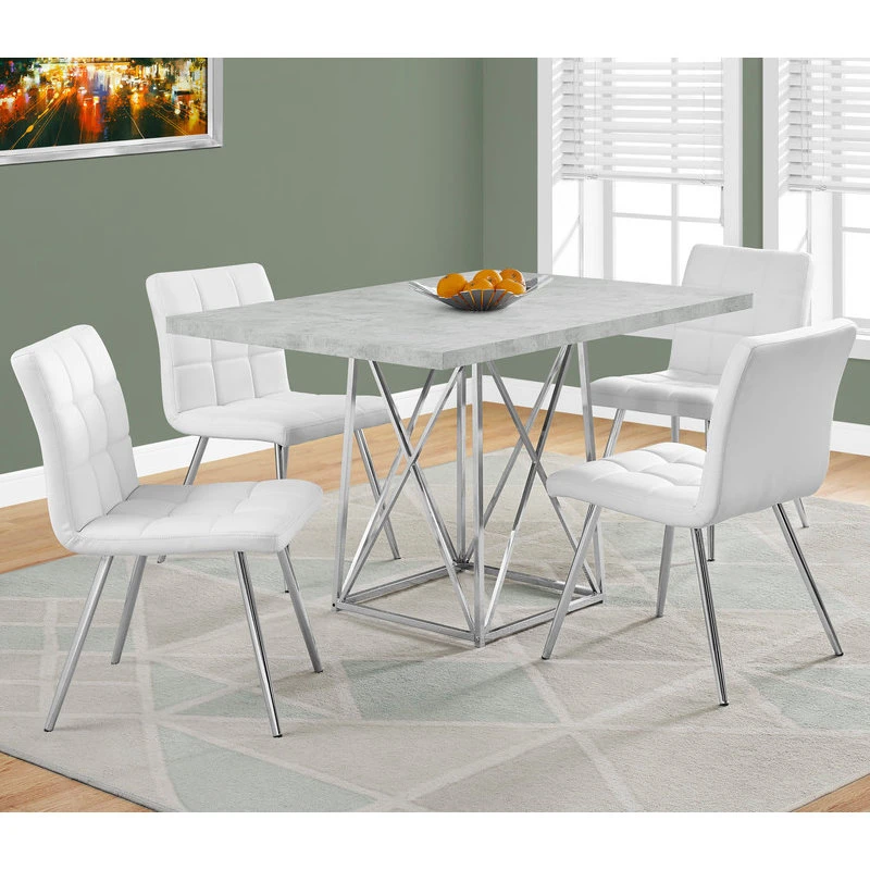 Create a modern industrial minimalist look to your dining space or kitchen area with this on-trend dining table. The rectangular top is finished with a cement-look veneer while the sleek track chrome metal legs with an x base design elevate the look to a whole new level. Ideal for small spaces, eat in kitchens or lofts, this dining and task table will continue to be in style for years to come and can be paired with a variety of modern/contemporary chair options. Chairs sold separately.