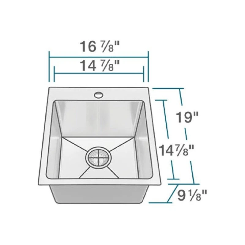 Created as a bar or food prep sink, this single-bowl design provides plenty of space for either use. It is mounted above the counter which will flaunt its 3/4-inch, corner radius style. Although small overall, its tight corners, square shape, and ample depth make it a wise choice. The T1717 is 304-grade, cold rolled steel, at the industry standard 18-gauge thickness. The surface is given a brushed-satin finish which adds to its luster and masks minor scratches which could occur over time. Dense, sound-dampening pads and an insulation coating are applied to the underside. With an overall measurement of 16 7/8″ x 19″ x 9 1/8″, it will require a minimum-width cabinet of 18″. It is cUPC certified. This listing does not include any accessories.