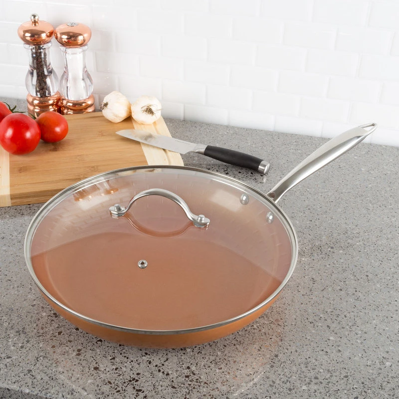 The Allumi-shield Frying Pan by Classic Cuisine is durable, anti-warping, aluminum cookware with 2 layers of non-stick ceramic coating for healthier cooking and easy clean up. The 12 frying pan has a convenient lid and a specially designed thick magnetic bottom for even heat distribution to efficiently create delicious and savory meals. This pan is oven proof up to 500F, dishwasher safe, compatible with gas, electric, induction and glass stove tops, and is also non-stick for a premium cooking experience that will last for years.