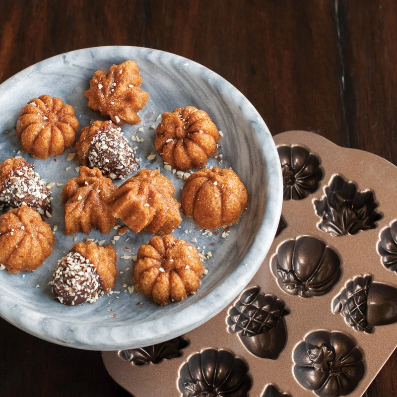 Bake delicious mini cakes with this Autumn Delights cakelet pan from Nordic Ware. This gold pan is made from cast aluminum so it’s tough and durable. The baking surface is nonstick so your cakes easily release from the cavities. The cavities feature leaf, pumpkin, and acorn shapes while integrated helper handles make transporting from oven to table simple. Even better, this pan is made in the USA and is backed by a manufacturer’s lifetime warranty.
