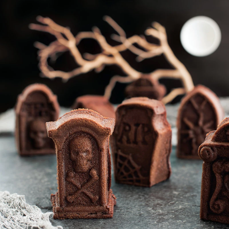 Bake scarily delicious mini cakes with this tombstone cakelet pan from Nordic Ware. This brown pan is made from cast aluminum so it’s tough and durable. The baking surface is nonstick so your cakes easily release from the cavities. The cavities feature various tombstone designs while integrated helper handles make transporting from oven to table simple. Even better, this pan is made in the USA and is backed by a manufacturer’s lifetime warranty.