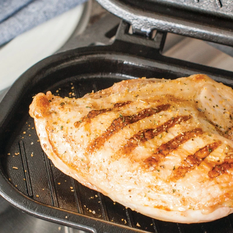 Create the perfect grilled cheese with this stovetop sandwich and grill press from Nordic Ware. This press was made in the USA and is specially designed and made from cast aluminium with durable nonstick coatings. You will never have to deal with only a portion of your food being cooked again thanks to the two interlocking hinges and diagonal rib design. These features ensure efficient cooking from the top and bottom for a quick meal. To use the pan, you should pre-heat one side for 90 seconds, flip and and pre-heat the other side for 60 seconds. It is compatible with gas, electric and ceramic stovetops.