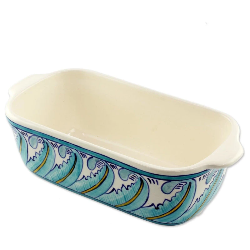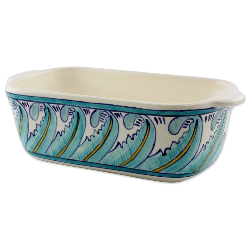 Stylized turquoise blue leaves sway in the tropical breeze in this hand crafted loaf pan. Guatemalan artisan Lilyan Benecke is inspired by the flora of her country, which she calls ‘the country of eternal spring.’This piece is signed ‘Topis Antigua,’ the name of this Guatemalan ceramics workshop. This loaf pan is oven safe up to 350 degrees Fahrenheit