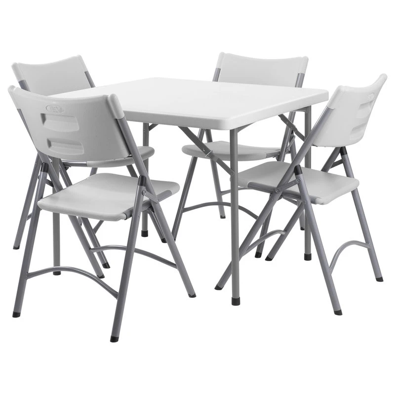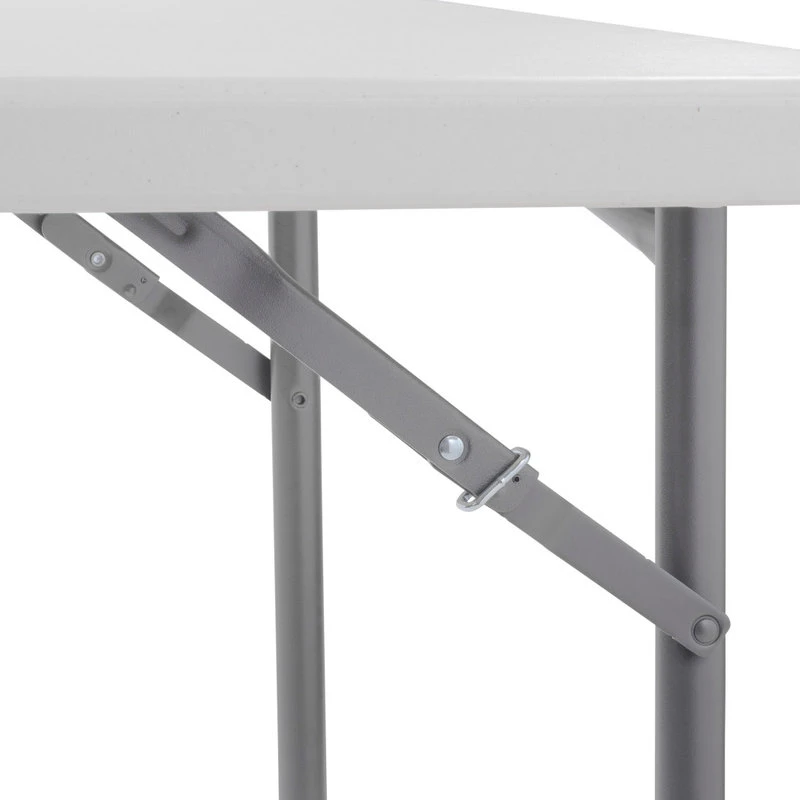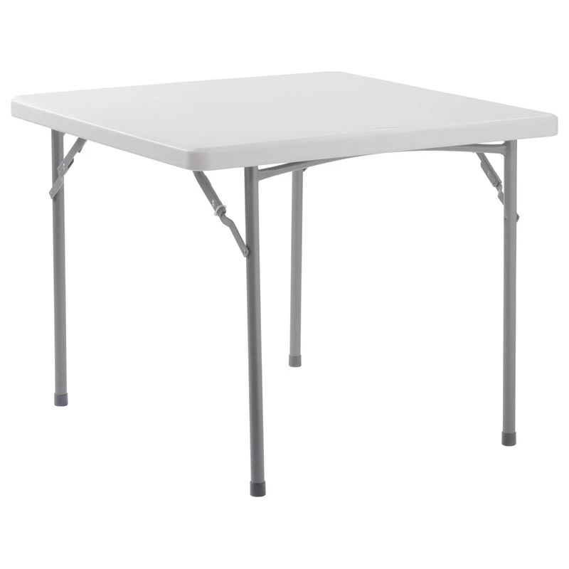Our BT3636 square blow-molded plastic folding table is the perfect solution for home, office, picnic and cafeteria use. Suitable for indoor or outdoor in any application that calls for affordable, lightweight, weather-resistant and highly durable folding tables. Their lightly textured design keeps them scratch-resistant yet still enables a surface smooth enough for writing. The plastic tabletop is heat-resistant up to 212º F and designed with a non-bowing eggshell structure for fortification to hold up to 300 lbs. of distributed weight! The tabletop color is a light speckled gray matching the textured gray powder-coated steel frame. The legs are straight style and feature gravity slide locks which maintain the table’s overall strength and support.