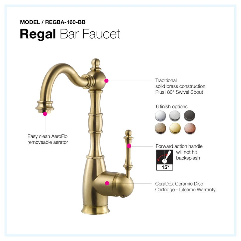 Completely crafted from solid brass, bold in traditional design and nostalgic to the senses, the Regal Traditional Bar Faucet adds classic style in a convenient bar size, available in 6 finishes.
