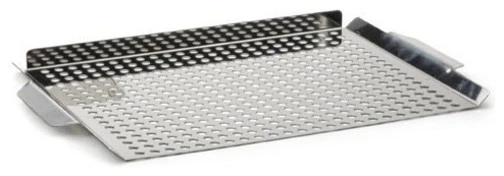 Grill fragile items without losing the bulk of them to the fire with the RSVP BBQ grilling pan. Fabricated from stainless steel, this grilling pan has perforations on the bottom to better heat transfer to the food above. Three side walls to keep your food nestled securely on the grilling pan while one side is flat to make it easy to remove it when cooked. Best of all, when you are finished using this grill pan, it can be easily cleaned in the dishwasher.