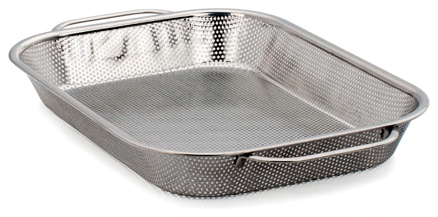 Cook up a succulent meal with this RSVP BBQ precision pierced roasting pan. Made of stainless steel, this pan keeps even the smallest pieces in the basket and out of the fire. Rectangular in shape and featuring a deep design, this pan is perfect for a variety of uses. Dishwasher safe, it makes clean up a breeze.