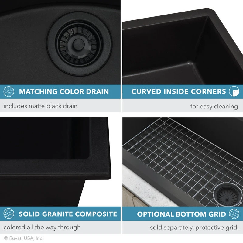 The epiGranite series of kitchen sinks from Ruvati sets a new trend for the home kitchen. If you are looking beyond stainless steel, and want to add some color and character to your kitchen design, the epiGranite sinks are an elegant choice. The sink is constructed from 80% crushed natural granite, giving the sink extreme durability and the look of real stone. The sink is colored all the way through, for a rich and consistent look that will never discolor. The surface of the sink undergoes a proprietary treatment making it resistant to stains, bacteria and extreme temperatures up to 536 degrees Fahrenheit. The sink comes with a basket strainer drain assembly that traps food waste and is easy to empty into the trash. Ruvati epiGranite sink comes in 8 different color options ranging from warm Caribbean Sand to elegant Black Galaxy. Now you can have a kitchen that truly reflects your style and personality.