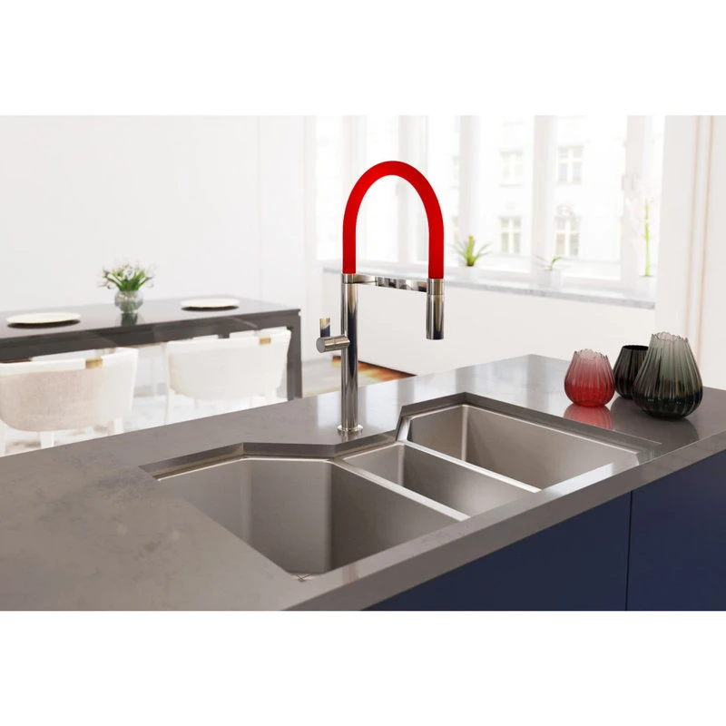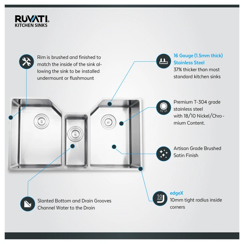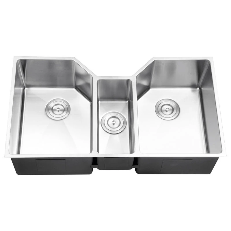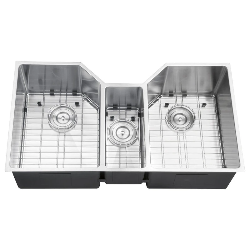 Gravena offers a modern, linear style with square / rectangular bowls. The tight radius corners make it easy to clean around the edges while maintaining the modern look. Rear drain placement ensures dishes left in the sink do not settle on the drain and prevent water flow, and the elegant drain grooves on the bottom channel water towards the drain keeping your sink clean and dry. Each sink is carefully handmade with premium 16 gauge stainless steel and comes with bottom rinse grids and basket strainers. The luxurious satin finish and heavy duty sound guard undercoating makes Gravena a perfect choice for your kitchen.
