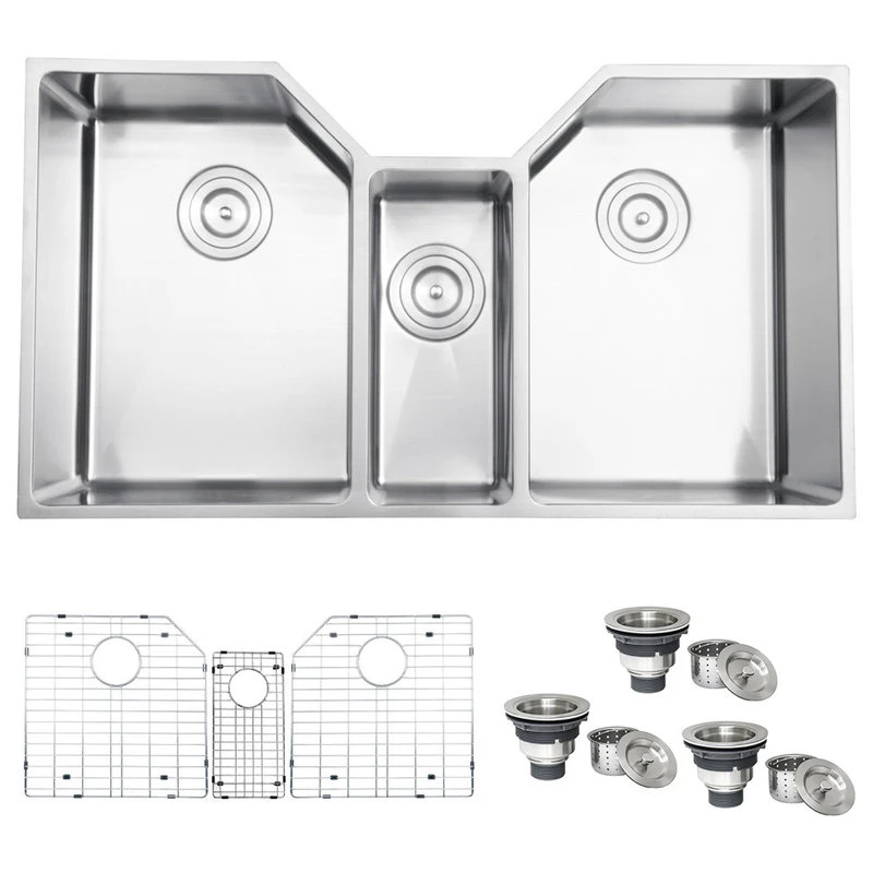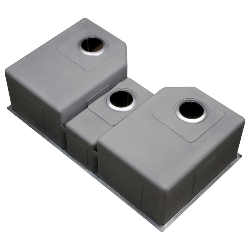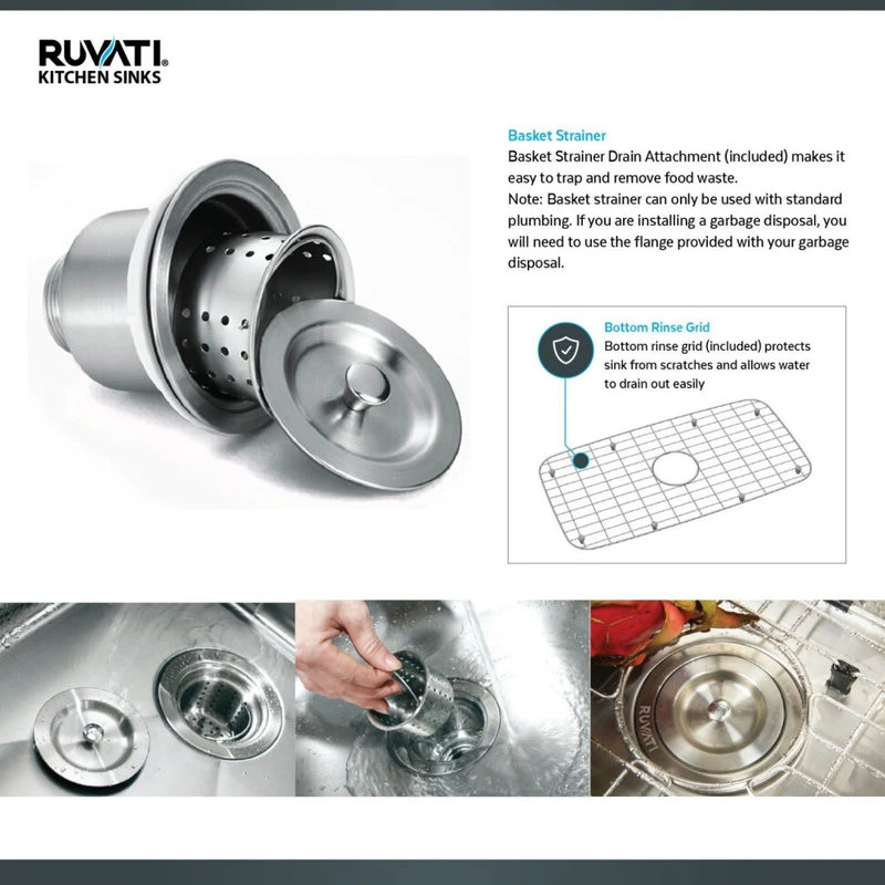 - Included in box: Sink, cut-out template, mounting brackets, rinse grids (set of 3), 3 basket strainers