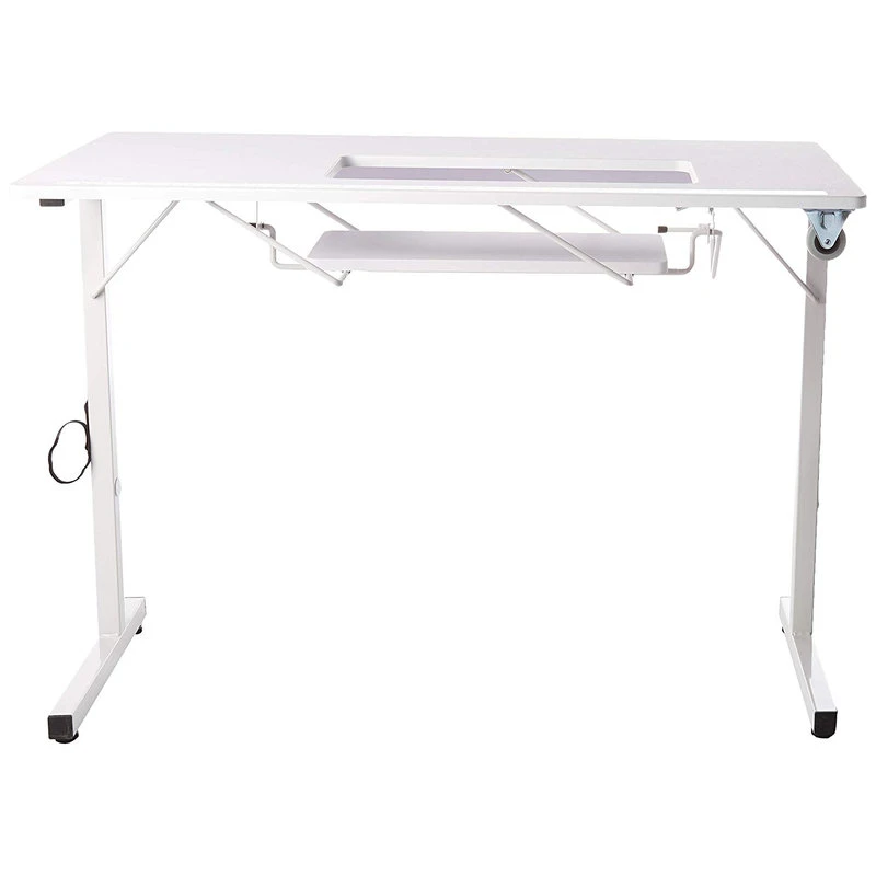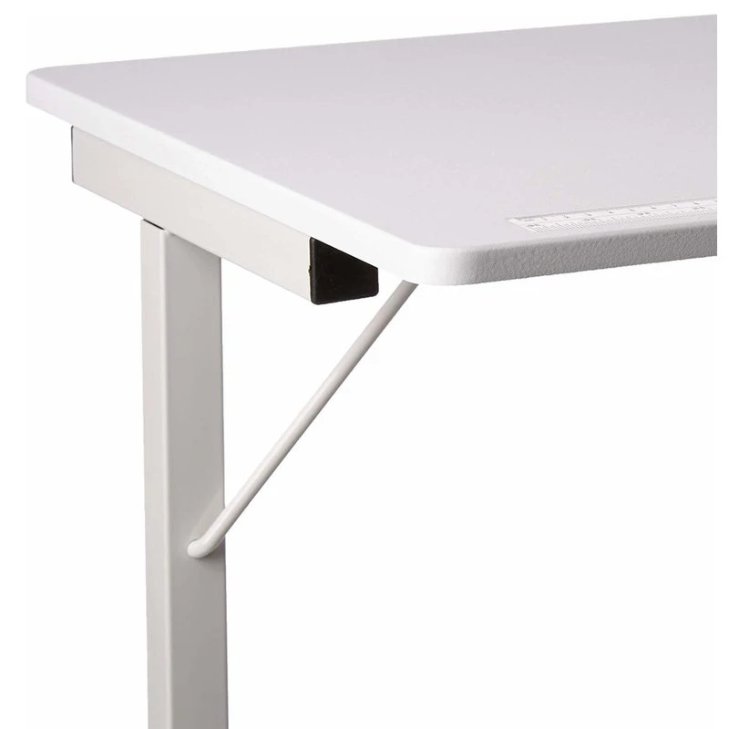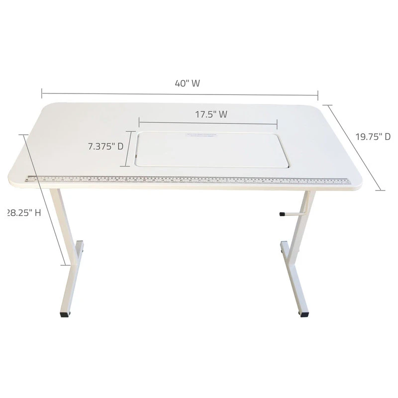Who else wants a portable sewing table that doubles as a drafting and fabric cutting surface. Announcing the SewStation 101, Sewing Table by SewingRite with adjustable height sewing machine rack. Not only does the table hold sewing machines up to 25 lbs., you can use it for cutting and measuring your fabric. You no longer need a sewing table AND a cutting table. It’s all in one! The sturdy steel legs give you a secure sewing station. And the steel pins beneath the table keep it from folding under the pressure of your heavy sewing machine. Keep your sewing space clean and tidy by simply folding up your table for storage when you’re done. It’s about the size of a card table and can slip in a closet or under a bed. SewStation accommodates sewing machines no larger than: 17-1/2″ wide, 7 3/8″ deep (front to back).