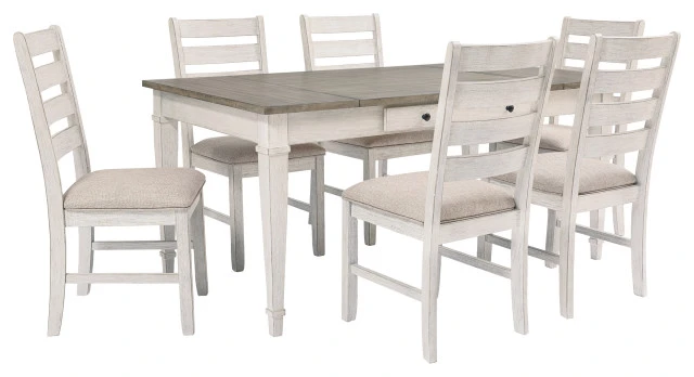 Set the scene for coastal chic or modern farmhouse living with this dining room table. Clean-lined, simply striking table doubles the charm with a brown tone top with plank effect, paired with a grayish white base with rub through effect for timeworn appeal. Multi-functional dining table features two convenient side drawers and a storage bin on each end for maximum use of space. Styled to comfortably seat six, this table makes room for one and all.