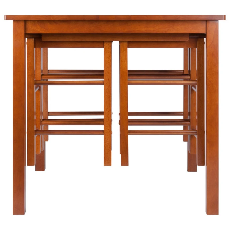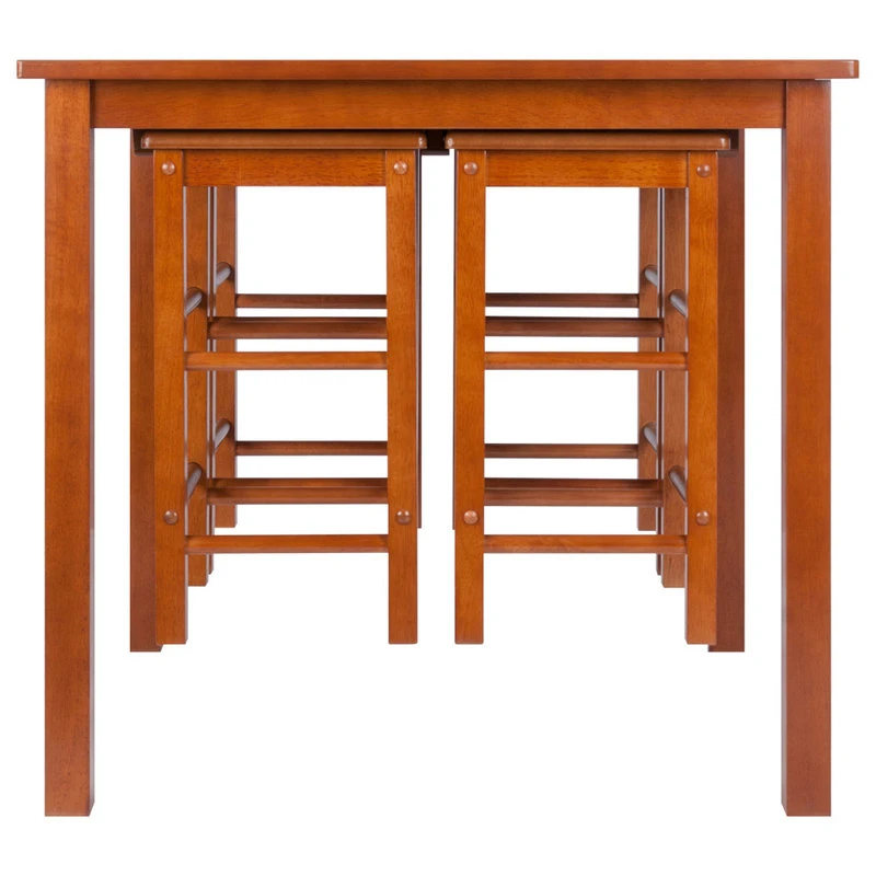 This inviting Stella 5-Piece Space Saver Set by Winsome Wood was designed to maximize small space living while offering big benefits. At 33″ square, this sturdy and compact table is perfect for your dining room or kitchen. It also makes an ideal place for games, puzzles, and crafts in the kids’ rooms, den, or family room. When not in use, all 4 stools can be stowed away on the slip-in rails under the tabletop, keeping the room uncluttered and providing easy access for cleaning and pick up. Pull out one or more stools as you need. This makes a great choice for a studio apartment or small spaces that need versatility. Both table and stools are made of solid wood for durability, and the natural wood grain, finished in Teak, adds warmth and polish to any setting. Conveniently packed and shipped in 1 box, that includes the hardware necessary for assembling. Replacement part request can be submitted directly to the manufacturer within 60 days from date of purchase.