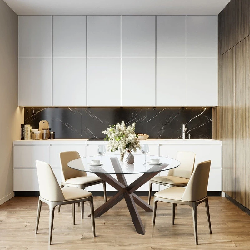 Timber takes the spotlight in this work of art that doubles as a dining table. The Kent’s 10mm glass top provides the perfect lens to admire its solid rubberwood base—three angled posts that lend an earthy, eye-catching aesthetic to any dining room. Plus, with seating for up to five, family meals and intimate gatherings are practically what it’s built for.