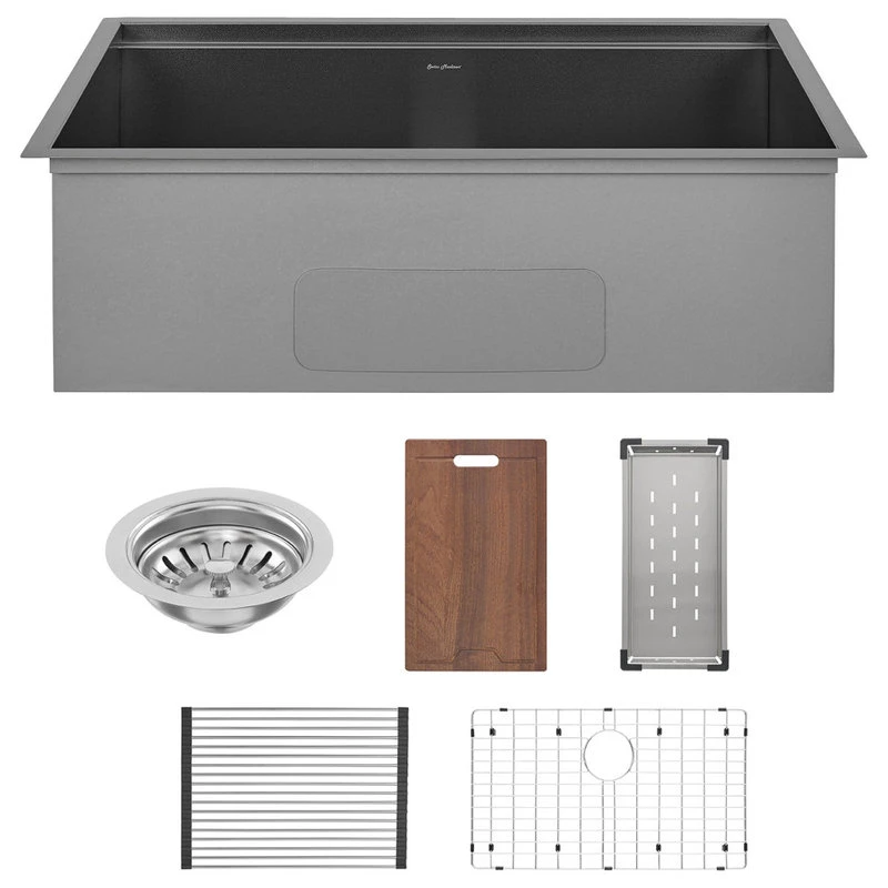 The Tourner Farmhouse Kitchen Sink is a stylish single basin sink that is a perfect addition to any kitchen setting. Crafted with stainless steel, this product is durable and built to last. This workstation includes a strainer, cutting board, colander, dryer rack, and bottom grid, allowing for efficiency from meal preparation to clean up. The deep bowl allows for uninterrupted space in washing and stacking dishes. Additionally, this sink’s PVD finish helps prevent stains and is scratch resistant, along with being engineered to withstand high temperatures.