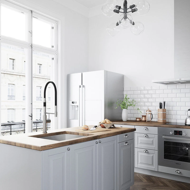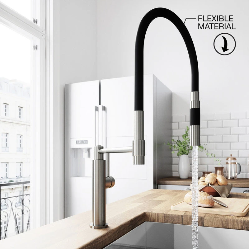 VIGO presents the Norwood Magnetic Spray Kitchen Faucet, featuring a magnetic-release spray head and a 360° swivel spout. Its solid brass construction and a premium hardware finish ensure long-lasting durability. Its single lever with a button-activated spray grants effortless control over water volume and temperature. Norwood’s spray nozzle resists mineral buildup, making it easy to clean and maintain. All mounting hardware and hot/cold lines are included in the package with simple installation instructions.