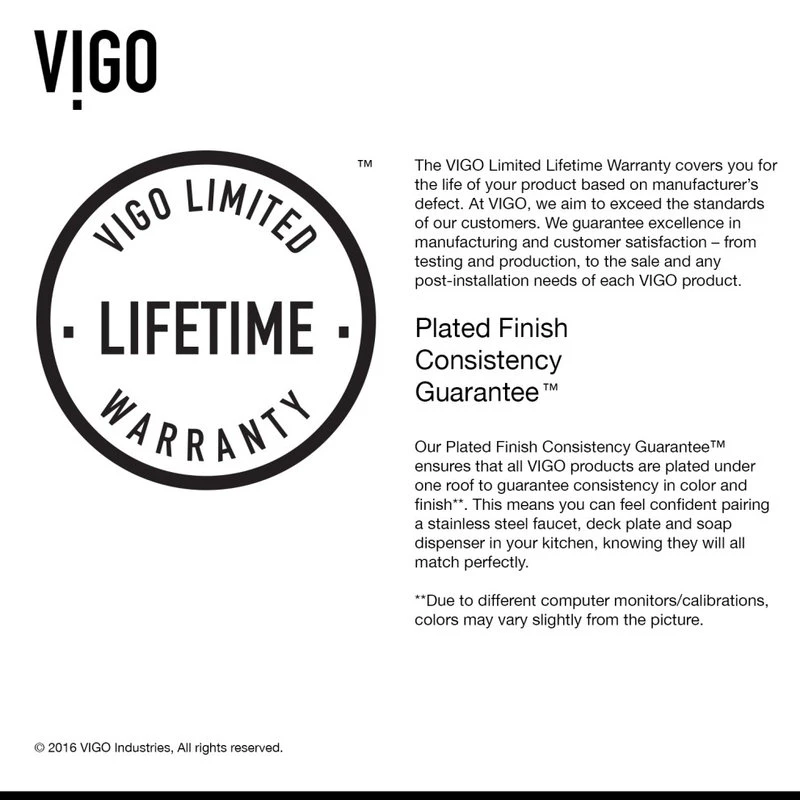 - QUALITY ASSURED WARRANTY: All VIGO kitchen products feature a customer driven Limited Lifetime Warranty.