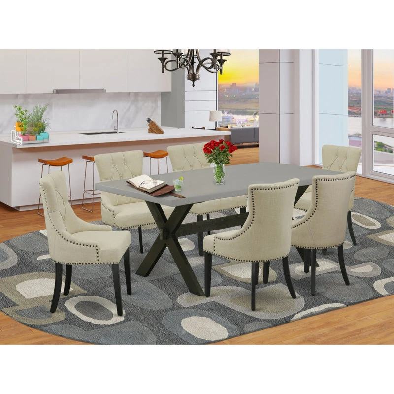 East West Furniture X697FR102-7 7-Pc Dinette Room Set – 6 Kitchen Chairs and 1 Modern Rectangular Cement Kitchen Dining Table Top with Button Tufted Chair Back – Wire Brushed Black FinishEAST WEST FURNITURE – X697FR102-7 – 7-PC KITCHEN DINING ROOM SET