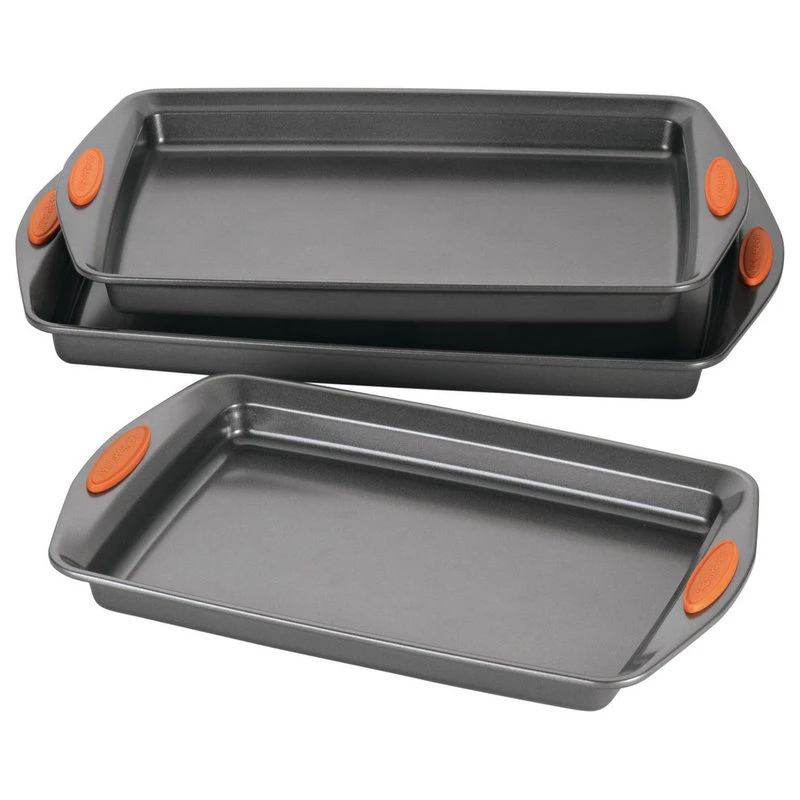 Hit a sweet or savory triple, with the Rachael Ray Yum-o! Nonstick Bakeware 3-Piece Oven Lovin Cookie Pan Set that includes three durable pans for creating delish baked foods.This bakeware is made from durable carbon steel that resists warping.